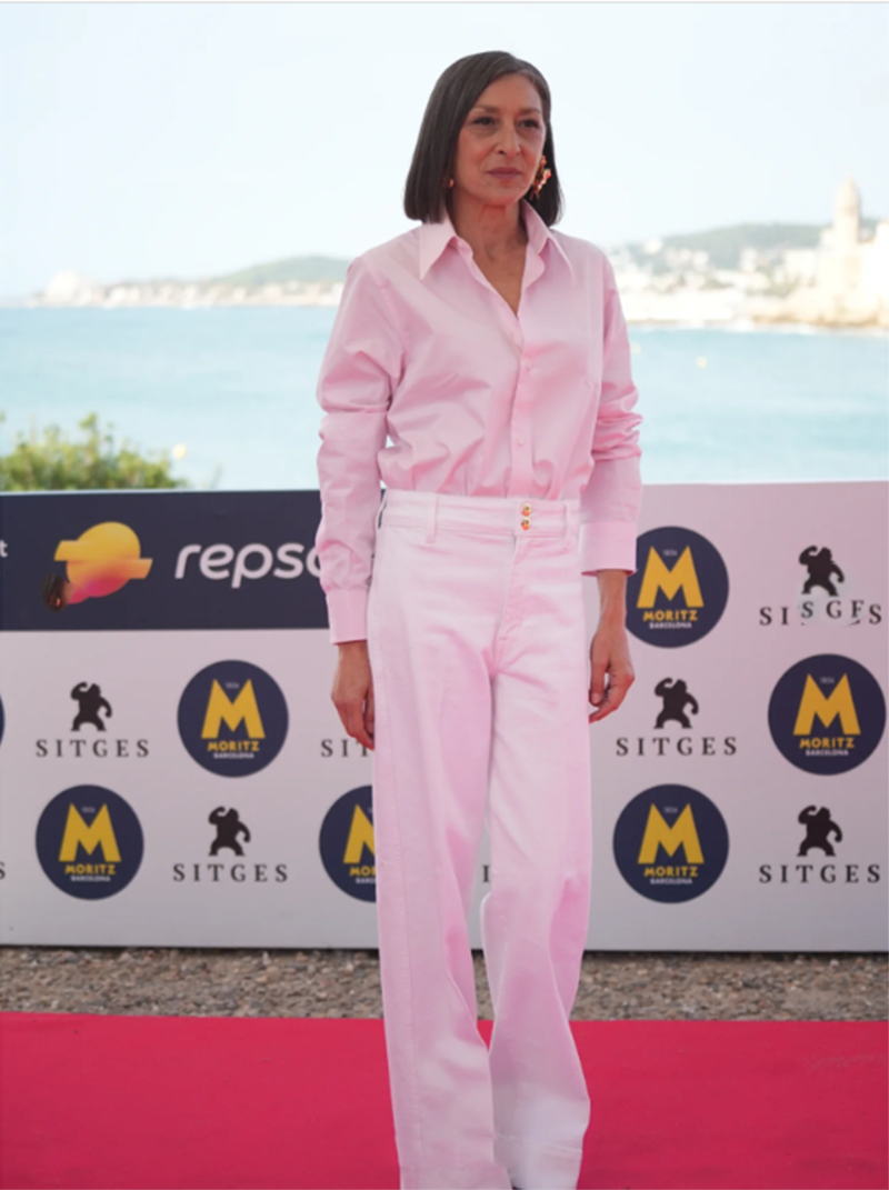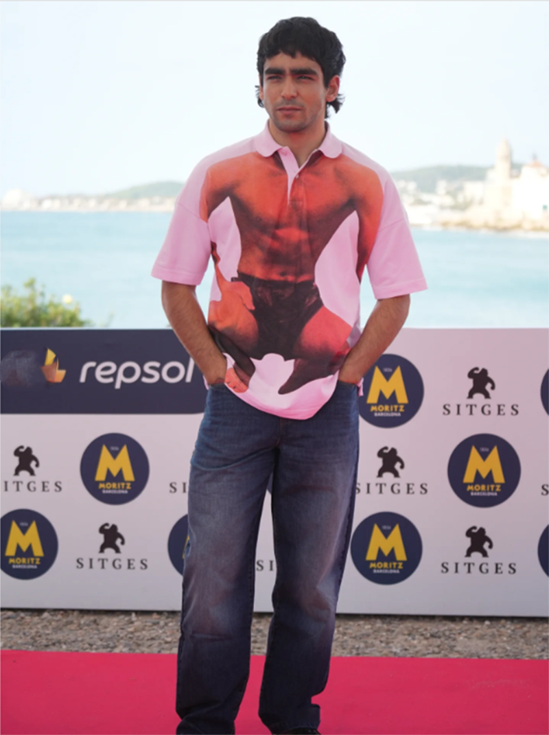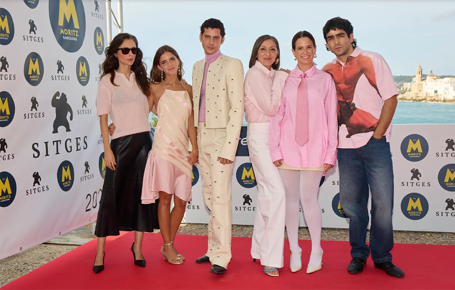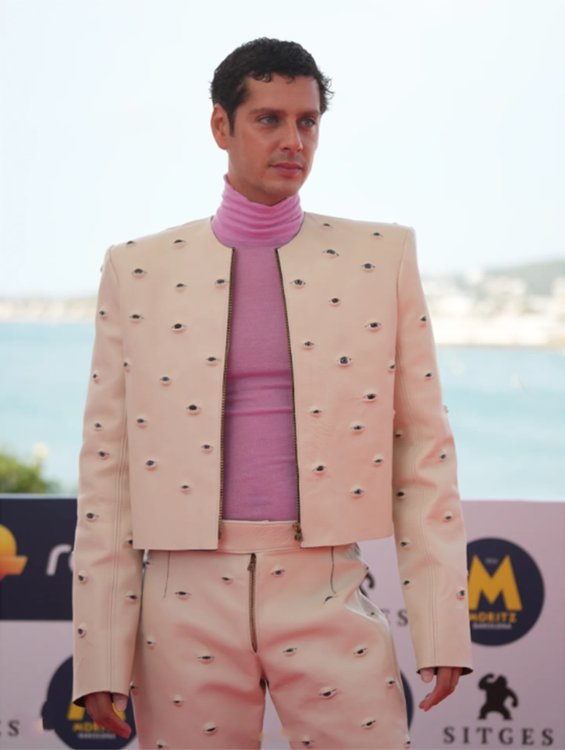 FESTIVAL DE SITGES, 12/10/2025. Con Eduardo Casanova llegó el glamour. Ya lo comprobamos hace tres años cuando vino a presentar a La piedad, y ahora lo confirmamos con Silencio. Traje de chaqueta torera y pantalón en rosa pastel (siempre rosa) con detalles de pedrería metálica en la superficie, y un suéter de cuello alto (neck roll) bajo la chaqueta en tono fucsia, introduciendo un contraste cromático visible que rompe la sobriedad de la sastrería. Sofisticación, elegancia y glamour. Al lado de Eduardo Casanova, sus actrices Leticia Dolera, Lucía Díez y Mariola Fuentes, no tienen nada que hacer. En los photocalls de las obras de Eduardo Casanova sólo hay una diva: él.