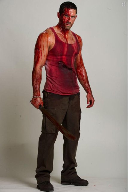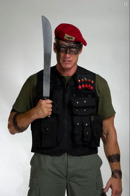<Tan impresionados hemos quedado con esta foto de promoción de Jean-Claude Van Damme para Los mercenarios 2, que ya le hemos pedido a un centro de artes gráficas que nos imprima una reproducción a tamaño natural recortada en cartón para ponerla en la entrada de la redacción. Rapado totalmente y machete en mano con mirada desafiante… bestial. No nos digan que no le ven una retirada a Marlon Brando como el coronel Kurtz de Apocalypse Now… ¡Para que luego no digan que Van Damme no es el Marlon Brando del siglo XXI!