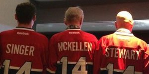 <Pero miren qué bien que se lo pasan Bryan Singer y sus actores en el rodaje de X-Men: Días del futuro pasado… Jugando partiditos de hockey entre escena y escena, y tomándoselo tan en serio por lo que se ve, que hasta se han confeccionado camisetas con sus nombres. Atentos a la alineación: Ashmore, Singer, McKellen, Stewart y Canto. O sea el Hombre de Hielo, Magneto, el Profesor X y Mancha Solar, más Singer ejerciendo de capitán y entrenador… (Lobezno, Tormenta, Pícara y Mística deben formar el equipo contrario con Cíclope de capitán…)